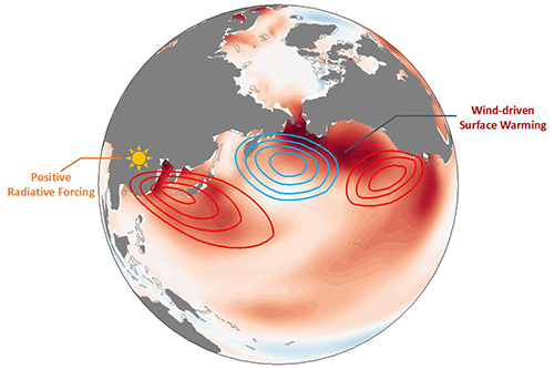 自2010年以来,东北太平洋发生了多次破纪录的极端暖海表面温度(SST)事件(也称暖斑或海洋热浪)。这些事件对海洋生态系统以及周边区域的天气和气候异常具有重要影响。研究表明,东北太平洋SST在过去100余年间主要呈现出年际变化的特征,并未对温室气体强迫导致的全球变暖有显著响应。但是自2010年以后,东北太平洋SST增暖呈现出显著加速的趋势,并带来了多次极端暖异常事件(图1)。已有的研究多将这一现象归因于气候系统的自然变率或全球气候变暖,但这些并不能解释最近东北太平洋SST增暖突然加速的现象。