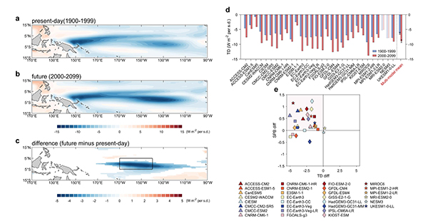 图2 (a-c) 历史和未来热带太平洋热力衰减负反馈的模态以及变化。(d) 不同模式中CP型ENSO热力衰减负反馈的变化。(e) 热力衰减负反馈与春季预报障碍的多模式间关系。