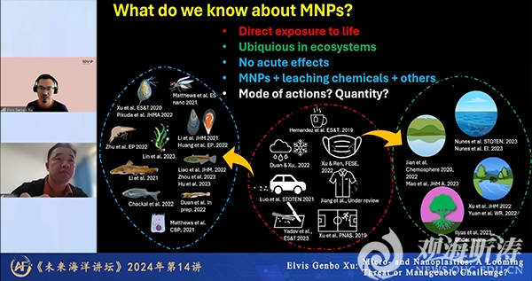 本站讯 5月27日,应未来海洋学院院长李建平教授和未来海洋学院导师郑浩教授联合邀请,南丹麦大学Elvis Genbo Xu教授做客“未来海洋讲坛”,作了题为“Micro- and Nano plastics: A Looming Threat or Manageable Challenge?(微塑料和纳米塑料:一个迫在眉睫的威胁还是易于管理的挑战?)”的学术讲座。讲座由郑浩教授主持,共有包括未来海洋学院学员在内的1.5万余位听众参与了讲座。