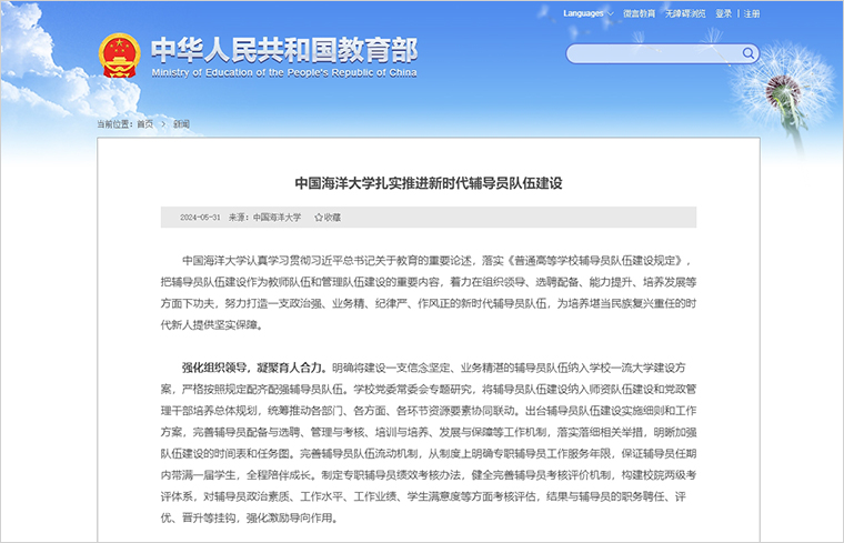 【编者按】近期,中央教育工作领导小组秘书组印发了《全面加强新时代高校辅导员队伍建设行动方案》,对全面推进新时代高校辅导员队伍专业化职业化专家化发展提出明确要求。长期以来,学校高度重视辅导员队伍建设,聚焦辅导员更好履行主责主业,强化组织领导、健全体制机制、优化队伍结构、深化培养培训、完善待遇保障,促进辅导员工作有条件、干事有平台,发展有空间,相关做法被教育部网站刊载。全文如下: