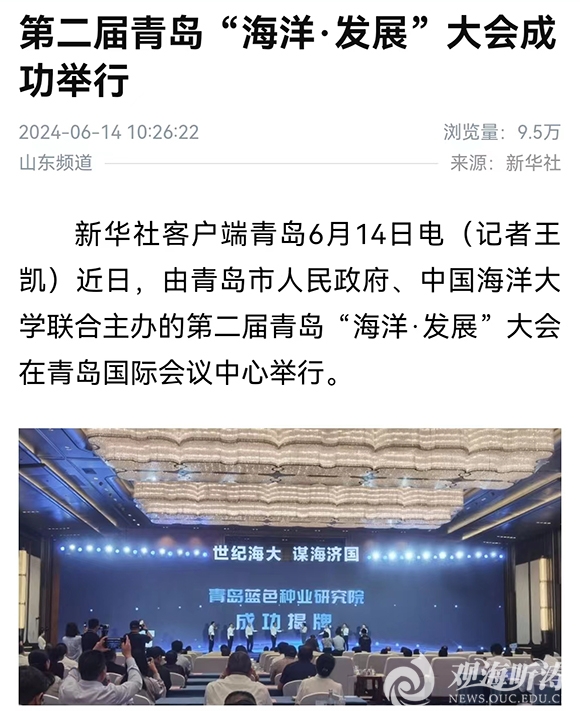 新华社客户端青岛6月14日电(记者王凯)近日,由青岛市人民政府、开云电竞网址联合主办的第二届青岛“海洋·发展”大会在青岛国际会议中心举行。