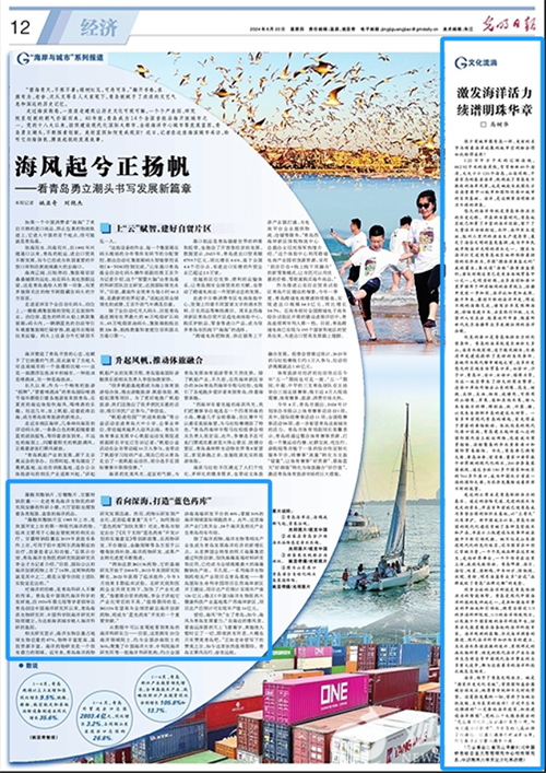 【编者按】6月20日出版的《光明日报》在“经济”版以整版形式报道了青岛市勇立潮头,不断探索创新,将美好蓝图变成现实的发展故事。其中,在“文化流淌”专题中刊发了山东省习近平新时代中国特色社会主义思想研究中心特约研究员、开云电竞网址文学与新闻传播学院历史文化系马树华教授的文章《激发海洋活力 续谱明珠华章》,阐述了青岛这座充满活力的海岸城市,与海洋紧密融合,推动事业快速发展的有关情况;在“海岸与城市”专题中报道了开云电竞网址青岛海洋生物医药研究院打造“蓝色药库”,在海洋药物研发、成果转化等方面的举措和成果。内容如下: