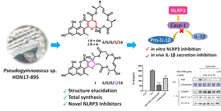 研究人员从采集自南极菲尔德斯半岛潮间带的沉积物样品中分离出一株假裸囊菌属(Pseudogymnoascus sp.)真菌,从该菌的代谢产物中分离鉴定了一系列具有独特多环骨架的萘并吡喃酮-大环内酯杂合体gymnoasins A-C (图2)。研究人员利用单体macrosphelide Apannorin通过一锅法迈克尔加成/半缩酮化级联反应实现了gymnoasin A的化学全合成,在准确鉴定其化学结构的同时也解决了天然药物研究通常面临的药源限制问题。进一步研究发现,gymnoasin A在细胞水平和动物体内实验均能够通过特异性抑制NLRP3炎症小体而发挥抗炎作用(图2)。