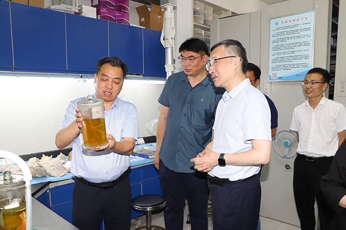 张峻峰一行先后考察了学院藻类种质库、贝类标本室,听取有关同志的介绍。水产学院院长艾庆辉汇报了水产学科发展现状及未来规划。张峻峰对学院在人才培养、学科建设、科学研究、国际交流合作等方面取得的成绩给予了充分肯定,并代表学校祝贺艾庆辉荣获2023年度国家科技进步二等奖。他指出,水产学科一直是学校的特色和优势学科之一,始终站在领域发展的最前沿,引领我国海水养殖五次浪潮,推动我国发展成为世界第一水产大国,为我国水产产业发展和保障国家粮食安全作出了重要贡献。他强调,要将人才队伍建设作为学院发展的重中之重,努力抓好高层次人才、优秀青年人才引育和梯队建设,探索优化适应水产学科的分类评价体系,鼓励教师扎根水产一线,把论文写在江河湖海上。要优化水产学科发展布局,锚定水产特色与主流方向,加强多学科交叉融合,发挥海洋生命科学与技术学科群优势,加强国家级学科平台建设,实现内涵拓展、协同创新。要提升水产一流人才培养水平,发挥好全国新农科水产教育联盟作用,统筹推进课堂教学、教材编写、课程建设,积极涵育人才培养的特色和亮点。要加强有组织科研,坚持“四个面向”,聚焦良种创制、营养病害、智慧渔业,着力实施“蓝色粮仓2.0”,全面提升原始创新和服务产业发展能力,打好“顶天立地”的科技创新攻坚战。要深化国内外合作与交流,拓展与国际一流高校科研合作,加强与行业相关部门交流,全面提升服务国家战略需求和经济社会发展的能力。