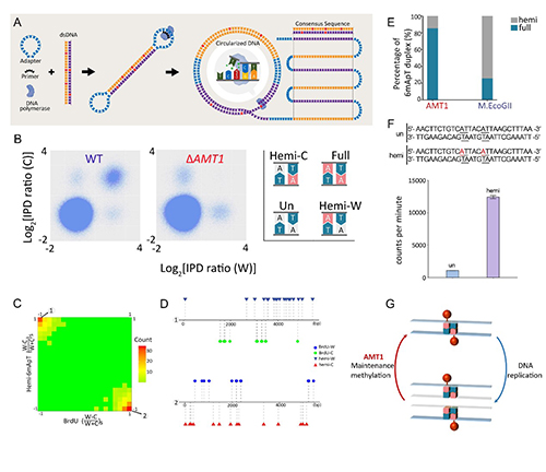 图1.6mA以半保留的方式进行遗传。 (A)SMRT-CCS测序原理示意图。 (B)AMT1敲除后全甲基化(Full)位点消失。 (C)半甲基化的6mA(Hemi-6mA)位点与BrdU标记的新生链互补分布,表明Hemi-6mA分布在母本链上。 (D)半甲基化的6mA(Hemi-6mA)位点与BrdU标记的新生链互补分布代表性位点示意图。 (E)AMT1倾向于将位点催化成全甲基化状态。 (F)体外酶活实验显示AMT1对半甲基化底物有明显的偏好性。 (G)6mA半保留遗传的模式图。