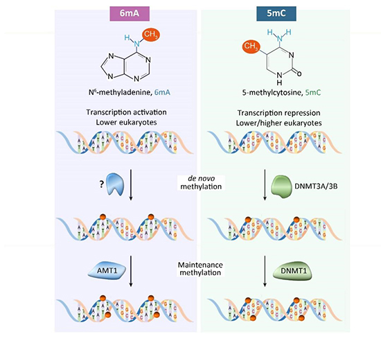 图2. 真核生物两种DNA甲基化(6mA vs. 5mC)调控通路比较。
