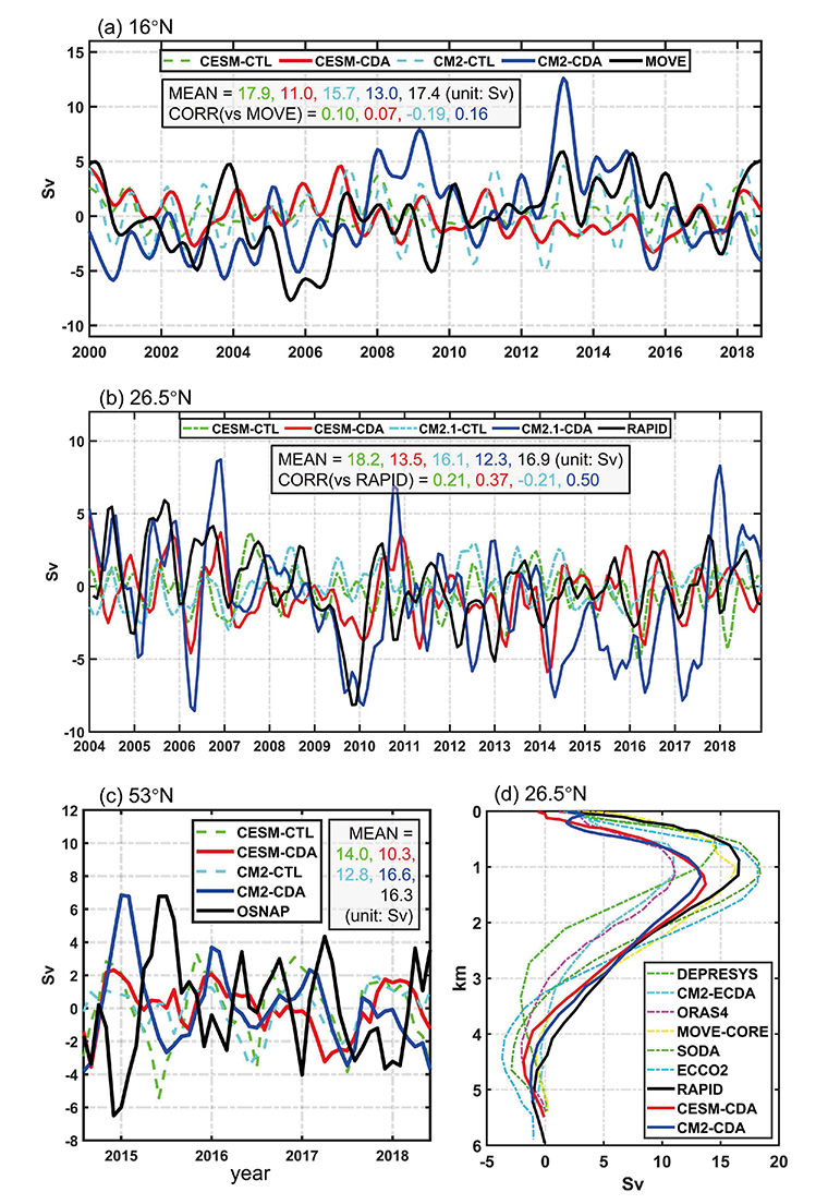 传统的耦合同化算法由于计算昂贵和信息抽取尺度单一等局限性,之前形成的再分析具有时间短、不同模式对大西洋经向翻转环流(AMOC)等重要模态分析发散等特点。研究团队首先基于2个独立的国际流行耦合模式,即通用地球系统模式CESM和第二代耦合模式CM2,研发了两套高效计算的多尺度耦合同化系统,通过对大气海洋多源观测资料和深海温盐气候态的同化,建立了两个多年代(1979-2018)的耦合试验再分析数据集,首先检测基于不同模式同化观测信息所得结果的一致性,然后从海洋热含量变化和大西洋经向翻转环流两方面对两套系统进行系统性评估。结果表明,两个耦合同化在重建主要气候模态及变率(如ENSO、PDO等)的同时,其产生的AMOC平均态具有一致性(图1),关键断面处的质量输运变率与观测结果基本吻合(图2)。