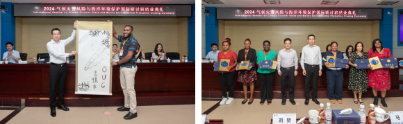 未来海洋学院院长、海洋碳中和中心主任、深海圈层与地球系统教育部前沿科学中心主任委员会副主任李建平教授主持典礼。大家共同观看了研讨班回顾短片。为庆祝即将到来的开云电竞网址百年华诞,来自萨摩亚的学员代表Fonoimoana女士和来自瓦努阿图学员代表Martin先生依次为学校赠送书法和书画作品。陈志华为所有参训学员颁发了结业证书,林旭升代表学校赠送了纪念品。