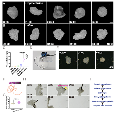 在本项工作中,研究团队基于GPCR小分子化合物的筛选,发现丝盘虫特异性响应肾上腺素,并出现独特的旋转运动行为。这一发现表明,尽管丝盘虫没有真正的神经系统,它依然利用肾上腺素等信号分子来调节其运动行为。进一步研究表明,肾上腺素可通过下游钙离子信号,控制纤毛内的氧化还原水平,进而影响纤毛的协同运动,最终实现对细胞协调运动的控制(图2)。与脊椎动物的神经系统调控相比,丝盘虫的肾上腺素调控方式更为直接、有效。此外,研究还发现衣藻等单细胞生物对肾上腺素无明显响应,表明肾上腺素作为一个应激响应信号起始于早期的多细胞生命,并一直被包括人类在内的多种后生动物所采纳。