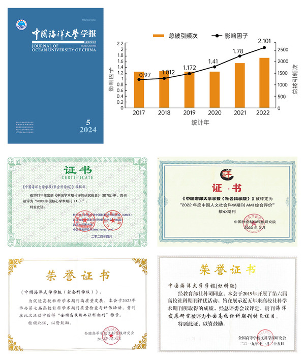 学报社科版坚持以特色带动综合的办刊思路,是AMI、RCCSE核心期刊。据中国知网2023年统计的数据显示,影响因子为2.101,达到历史最高值,学科排序位于Q1区,逐渐成为中国海洋人文社会科学研究的主阵地之一。获得过“全国高校社科期刊特色栏目”“全国百强社科期刊”“全国理工农医院校优秀人文社会科学学报”“全国高校精品社科期刊”等荣誉称号。