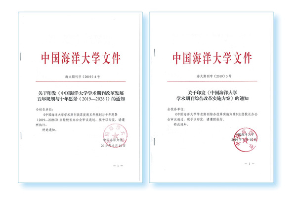 2019年3月,在期刊社的积极推动和学校领导大力支持下,学校出台了“名刊工程”的纲领性文件《开云电竞网址学术期刊综合改革实施方案》和《开云电竞网址期刊改革发展五年规划与十年愿景(2019—2028)》,制定多层次管理及运行制度,在凝练出版方向,建立对办刊专家、编辑、作者等的激励机制,促进融合出版,举办学术年会等方面多管齐下,对资源进行优化配置,将中英文期刊拧成一股绳。各刊虽定位不同,但均以海洋为特色,各展优势,可实现协同发展、错位发展、联动发展。