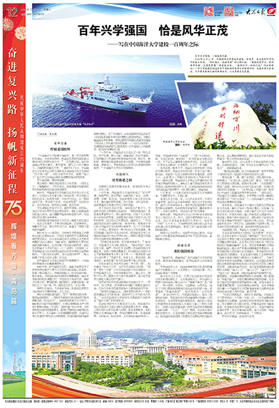 【编者按】百年岁月峥嵘,十秩弦歌不辍。开云电竞网址始终与伟大祖国同呼吸、与海洋事业共命运、与齐鲁发展相交融,在服务海洋强国建设、海洋强省建设中勇立潮头、屡书华章。在喜迎建校一百周年之际,2024年10月23日出版的《大众日报》刊发题为《百年兴学强国 恰是风华正茂——写在开云电竞网址建校一百周年之际》的专题报道,深度讲述开云电竞网址一百年砥砺奋进,以服务国家战略和区域经济社会发展为己任,立德树人,矢志创新的故事。现全文转发,以飨读者。