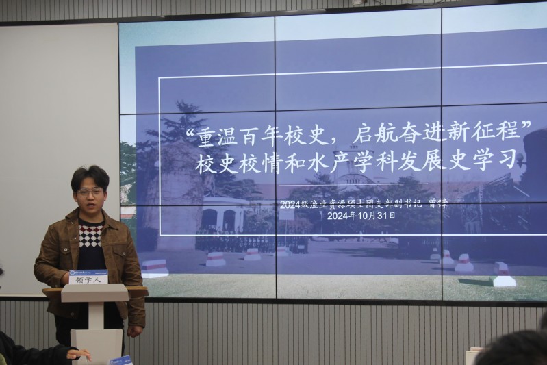 2024级渔业资源硕士团支部副书记曾锋以“历史沿革”“山海相望”“名师风尚”和“百年辉煌”四个主题,介绍了学校的百年发展历程,以及水产学院建设发展史和引领学科发展、服务国家战略取得的成就。团员青年们进一步加深了对学校发展和学科建设的认识,纷纷表示要进一步增强投身海洋强国建设的责任感、使命感和紧迫感,努力成长为堪当时代重任的优秀海洋人才。