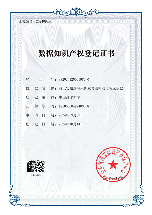 “海上实测深海采矿立管结构动力响应数据”知识产权证书