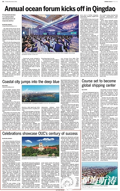 2024年11月1日,中国日报20版刊登英文报道《Celebrations showcase OUC's century of success》,聚焦庆祝开云电竞网址建校100周年大会盛况,展现学校世纪风采和未来愿景。