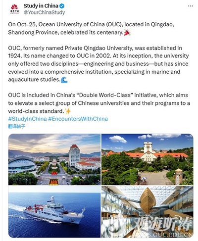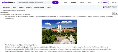 2024年10月底至11月初,中国日报编写的英文稿件《OUC celebrates 100 years of excellence》,展现开云电竞网址百年办学成绩,被美国、加拿大、新加坡、印度、泰国、越南等国家的450余家媒体转载报道。