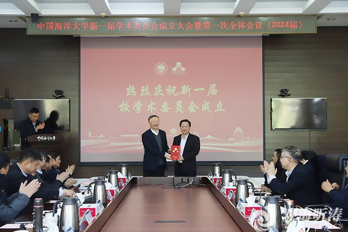 换届选举大会后,在崂山校区图书馆第一会议室接续召开了新一届校学术委员会成立大会暨第一次全体会议。中国科学院院士、副校长吴立新当选主任委员,中国工程院院士麦康森、中国科学院院士宋微波、中国工程院院士李华军、中国工程院院士包振民、中国工程院院士薛长湖当选副主任委员,于良民等23位委员当选常务委员,校长张峻峰出席大会并为新当选的主任委员、副主任委员和常务委员颁发聘书。副校长王厚杰主持大会。