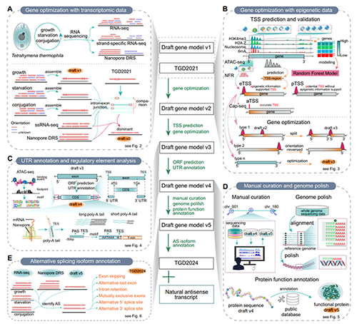嗜热四膜虫(Tetrahymena thermophila)是一种广泛应用于基础生物学研究的单细胞模式真核生物,曾因核酶和端粒酶的研究分别斩获1989年诺贝尔化学奖和2009年诺贝尔生理或医学奖。四膜虫大核基因组已历经多次组装和注释,其中包括2020年由学校海洋生物多样性与进化研究所原生动物学团队高珊教授课题组率先完成的端粒到端粒的完整基因组组装。然而,现有的基因注释仍存在诸多不足,例如基因错误注释、TSS和TES位置不准确,以及UTR信息缺失等。近日,高珊教授课题组通过整合大规模的转录组数据和表观遗传学数据,运用机器学习模型、人工核对和实验验证,深度优化了嗜热四膜虫大核基因组的注释,相关成果Comprehensive genomeannotation of the model ciliate Tetrahymena thermophila by in-depth epigenetic and transcriptomic profiling(利用大规模的转录组和表观组数据深度优化模式生物嗜热四膜虫的基因组注释)于2024年12月9日在线发表于Nucleic Acids Research杂志上。