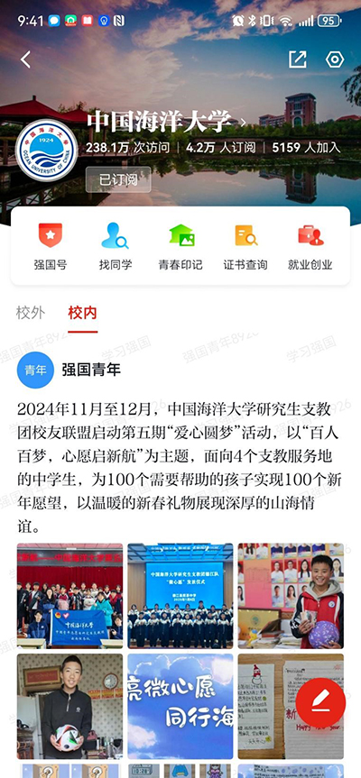 学校自2021年9月作为试点高校,第一批开通“学习强国”同学汇以来,完善运营机制,创新方式方法,加强互动联通,积极发动师生分享校园学习生活,与全国平台联合推出“嗨,少年,我在大学等你”等专题企划,发起“永远热爱,我们的海大!”“世纪海大 谋海济国”等话题,策划拍摄“强国有我 学无止境”答题视频、场馆育人系列视频,受到师生广泛欢迎。学校同学汇累计发布作品1250余件,分享内容多次被“学习强国”学习平台首页推荐,连续三年在“学习强国”同学汇年度评选中获评先进。