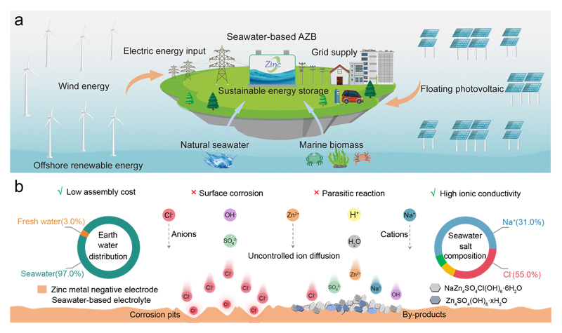 将海水电解液与锌金属电极配对,因其本质安全、成本极低且水源无限,有望成为海上大储能最具可持续性的替代方案之一。然而,鉴于海水中存在氯离子和复杂阳离子,要在海水电解液中稳定锌金属负极仍面临巨大挑战。研究团队首先揭示了氯离子点蚀会引发负极腐蚀,并加剧枝晶生长,从而导致电池快速失效。然后,研究团队提出了一种电荷梯度界面策略来调节界面处的离子传输,既抑制了氯离子在锌金属负极表面的积累,又加速了锌离子的扩散,从而促进了均匀的锌沉积,并减轻了腐蚀和副反应,使锌负极寿命提升40倍。基于海水电解液的锌离子全电池可实现5 mAh cm-2的面容量,并稳定运行超过500次循环。这项工作为稳定海水电解液系统中的锌金属负极以及构建可持续的海水基储能装置提供了可行的指导方针。相关创新研究成果“All-natural charge gradient interface for sustainable seawater zinc batteries”(全天然梯度界面实现可持续海水锌电池)日前发表于《自然-通讯》(Nature Communications)。研究成果的第一完成单位是开云电竞网址材料科学与工程学院,第一作者是学院2022级博士生范文杰。