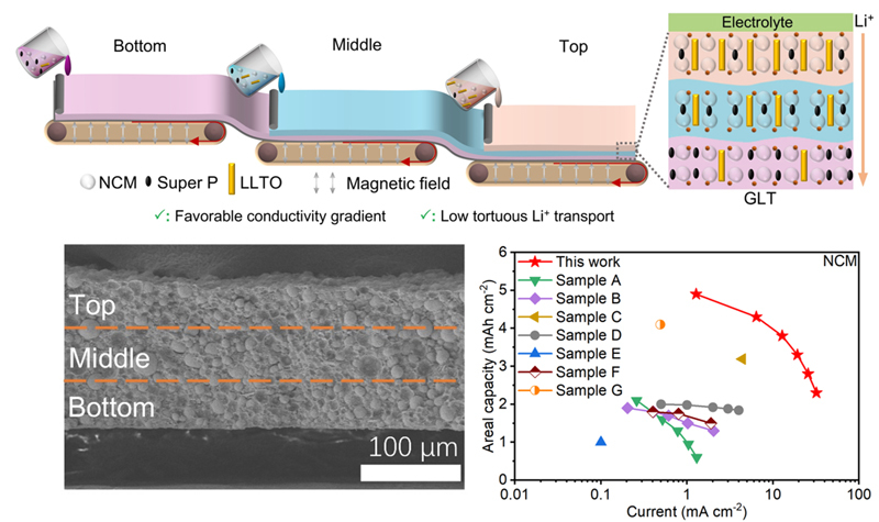 图2.低迂曲度梯度电极制备示意图和电化学性能比较图