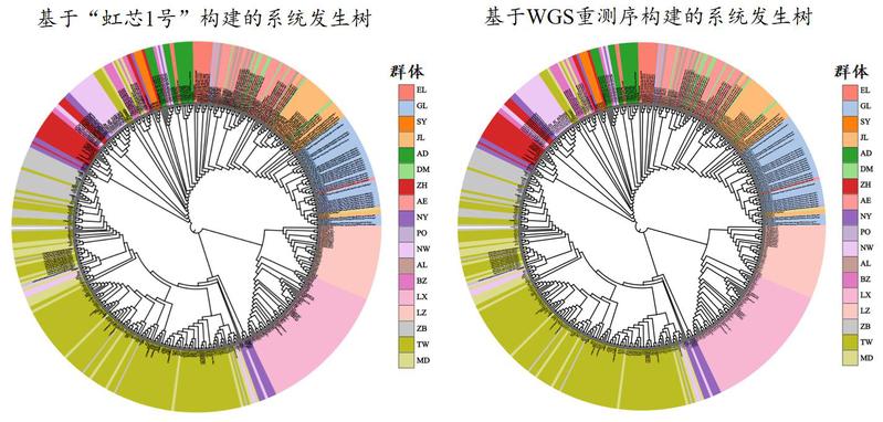 图4 “虹芯1号”与重测序数据的系统发生树对比