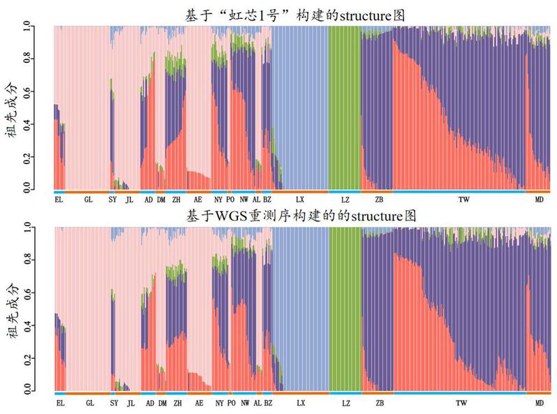 图5 “虹芯1号”与重测序数据的STRUCTURE结果对比