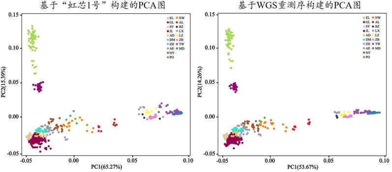 图3 “虹芯1号”与重测序数据的PCA主成分分群效果对比