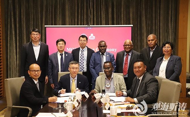 会谈期间,张峻峰校长与特兰斯福姆·阿奎罗校长、劳伦斯·海沃德省长、JYQ集团主席杨坚庆就共建海水养殖研发中心签署合作谅解备忘录。