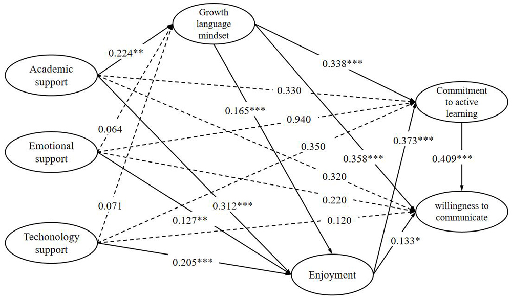 研究结果(图3)显示:(1)教师支持,包括情感支持、学业支持和技术支持,以及成长型语言心态,与愉悦感之间呈显著正相关。(2)成长型语言心态和愉悦感对积极学习承诺和二语交际意愿都有积极的预测作用。(3)教师支持不能直接预测积极学习承诺或二语交际意愿,而是通过间接途径影响这些结果。具体而言,教师支持通过成长型语言心态和愉悦感的连续中介作用预测积极学习承诺,通过成长型语言心态的中介效应预测二语交际意愿。