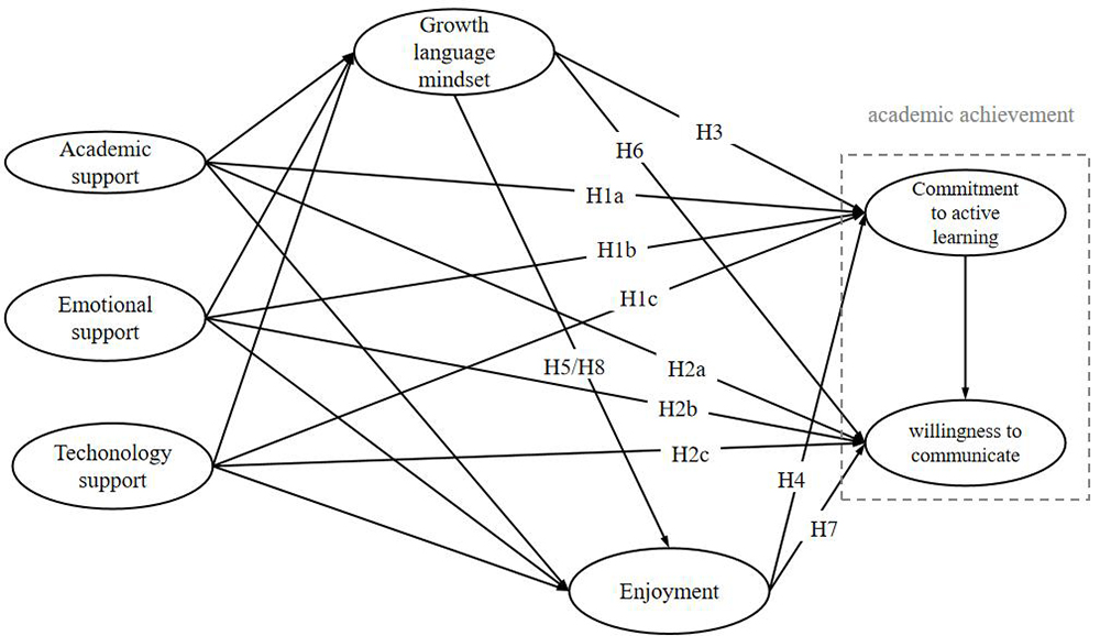 基于学界对社会环境、个性因素和情感与学业成就之间综合机制的关注,本研究融合二语交际意愿模型与控制-价值理论(图1),构建了一个链式中介模型(图2),旨在考察教师支持、成长型语言心态、愉悦、积极学习承诺和二语交际意愿之间的关系。