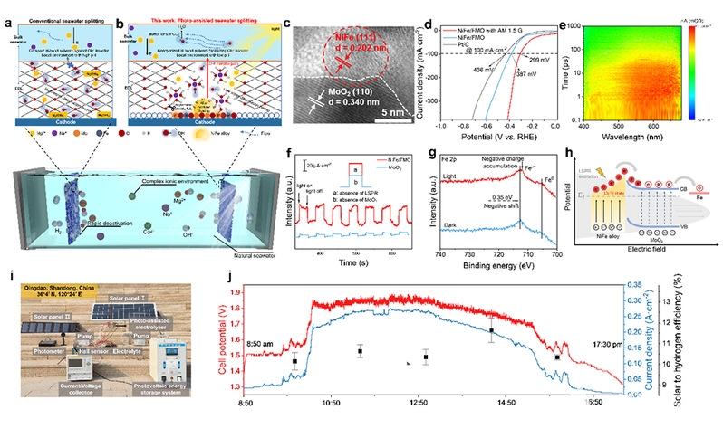 本研究提出了一种基于光诱导不对称电场(PAEF)来调控界面水分子构型的有效策略。首先,PAEF在光照条件下能够动态调整界面水氢键网络,形成OH⁻扩散通道并促进水分子的重新排布。进而促使OH⁻向海水中的快速扩散;同时,通过增加的水合钠离子能够将界面水分子重新调整为H-down构型,进而缩短H与活性位点间的间距,降低水解离的动力学能垒。最终,经实验验证,所制备的光响应催化剂体系在AM 1.5G光照下表现出优异的天然海水析氢性能(299 mV@100 mA cm-2)。同时,基于PAEF效应的催化体系表现出优异的抗沉淀能力,能够在连续运行100小时(100 mA cm-2)后活性衰减< 5%。此外,本工作进一步设计构建了一种光辅助不对称电解槽(阴极室为天然海水,阳极室为NaOH溶液),在2.35V(60°C)下即可达到0.5 A cm-2的电流密度。同时,将电催化系统与太阳能电池模块集成后,在波动光照条件下仍能保持良好兼容性及高STH转换效率(>10%)。该工作为天然海水电解提供了一条有效的新路径。