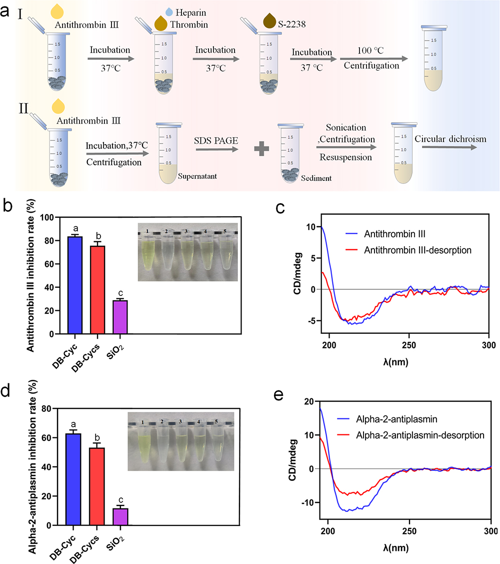 该研究系统揭示了DBs与血液接触后其表面吸附蛋白的演变进程,发现DBs对凝血因子的选择性吸附行为和专一性抑制作用是引发促凝血反应的关键作用机制。基于实验验证和分子模拟结果,发现DBs通过其微纳米层级多孔结构所带来的尺寸筛分效应,实现对抗凝血酶III和α-2抗纤溶酶的高效富集和定向抑制,使血液系统处于高凝状态;其表面硅醇基团可以激活内源性凝血途径相关因子,包括凝血因子V、IX、X、XI和 XII,从而促进凝血反应发生。随后,通过将肝素引入全血中以增强抗凝血酶III活力,证实了DBs的结构界面效应对抗凝血酶III活性的高效抑制作用。最后,建立了血液肝素化的大鼠断尾模型和兔股静脉穿刺模型,从动物水平上进一步评估了DBs在出血性疾病治疗方面的应用潜力。该工作系统的解析了DBs促凝血活性的分子机制,同时也为无机多孔材料的生物活性调控以及新型止血材料的设计提供了新思路。