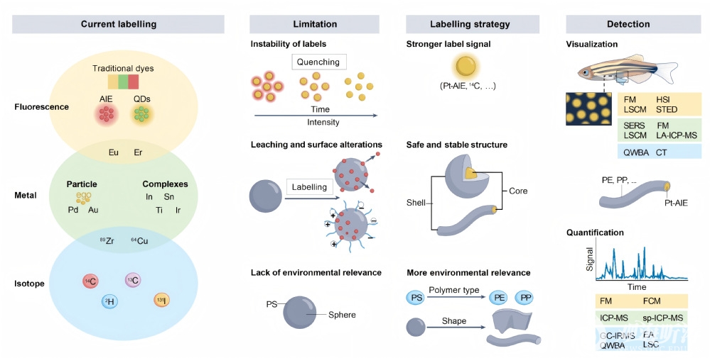 该研究成果首先梳理了当前MNPs主要检测方法的发展历程、优缺点与适用范畴;重点总结了生物体中MNPs的体内和体外检测方法,并针对不同类型生物提出了定制化的前处理和检测策略,以实现MNPs的准确识别与定量(图1);获得了MNPs在人体各组织和器官中的分布规律,剖析了MNPs与健康风险的潜在关联;针对生物体内MNPs难以追踪与定量的难题,系统评述了MNPs的标记方法及局限性,并提出了MNPs同步示踪与检测的新策略(图2);最后,鉴于生物样本稀缺、MNPs含量低、样本前处理复杂等局限性,提出了基于机器学习辅助MNPs快速识别与全面表征的新思路。该研究成果提供了生物样本中MNPs检测与表征的系统性解决方案,推动了MNPs分析全流程的国际标准化进程,为MNPs的生态与人体健康风险评估提供了重要支撑。