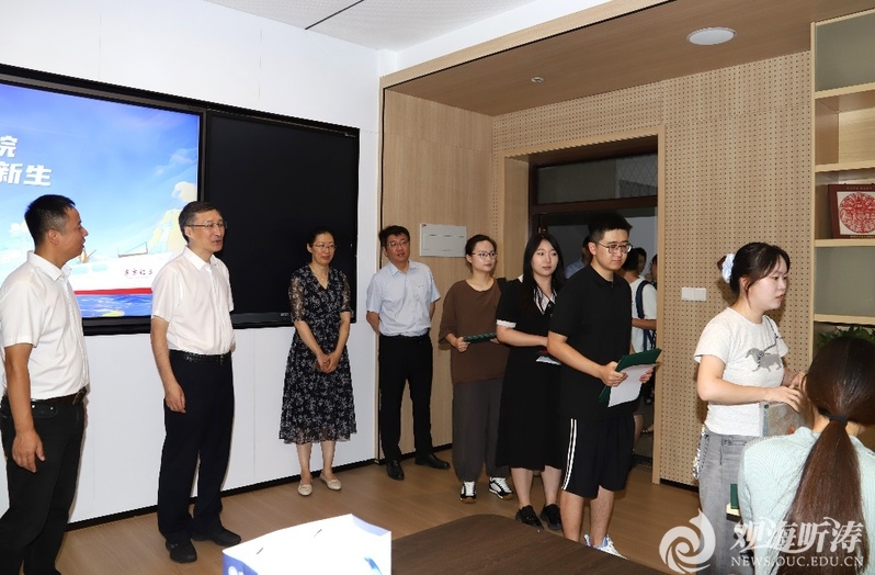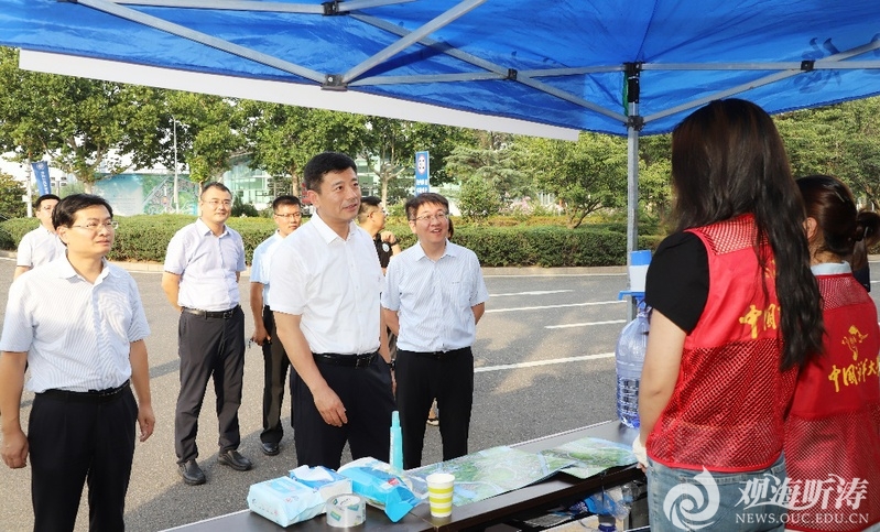 张峻峰一行先后来到海洋与大气学院、化学化工学院、崂山校区南门学生党员先锋服务岗、南海苑学生宿舍区,查看新生报到接待点设置情况,了解新生注册及信息采集相关流程,并同新生及家长亲切交流。