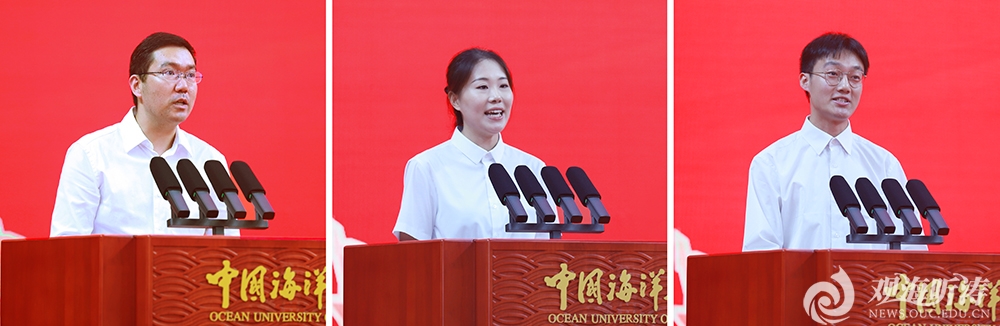 研究生指导教师代表李晟(左)、在校研究生代表李亚男(中)、新生代表张子尚在典礼上发言