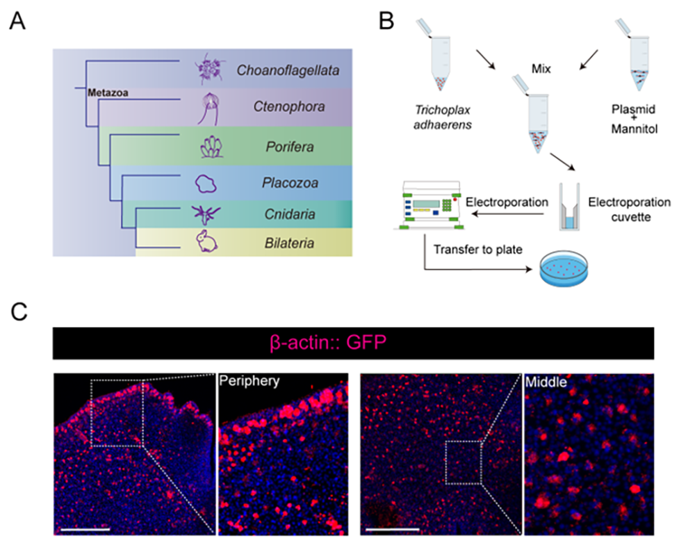 此外,课题组近期还在动物学期刊Zoological Research(《动物学研究》)在线发表了题为“Establishment of transgenic method in Trichoplax adhaerens”(丝盘虫转基因技术的建立)的研究论文,介绍了课题组在丝盘虫中建立转基因技术的尝试。研究人员通过筛选,建立了一种基于电转染方式,在丝盘虫瞬时表达外源基因的转基因方法。同时,筛选到了丝盘虫内源高效表达的启动子,为未来构建稳定转基因品系提供了潜在策略。
