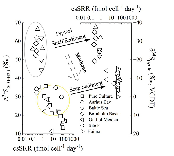 在典型海洋沉积物中,受有机质可利用性的限制,单个细胞的硫酸盐还原速率(csSRR)较低,通常会产生接近热力学平衡状态的高硫同位素分馏(60–70‰)。而实验室模拟实验证实,在甲烷浓度升高的驱动下,硫酸盐还原菌的强烈代谢活动可导致硫同位素分馏幅度显著降低(20–40‰),从而形成具有显著重硫同位素组成特征的黄铁矿。虽已有研究基于间接证据探讨甲烷通量与硫同位素组成的相关性,但迄今在现代自然沉积体系中仍缺乏直接证实甲烷浓度与硫同位素组成关联性的实证证据。富甲烷冷泉沉积系统硫组分同位素特征及其相关分馏效应仍缺乏系统认知。