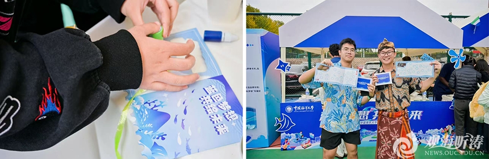 “蓝色梦想”互动区是本次国际文化节最具特色和温情的板块。中外学子在蓝色心愿卡上写下对海洋、对世界、对未来的愿望和祝福,投入“梦想之海”,并亲手制作象征智慧与希望的“蓝色果实”纪念品。参与活动的师生手持盖满各国印章的“船票”兑换纪念品,在主题相框前打卡留念。