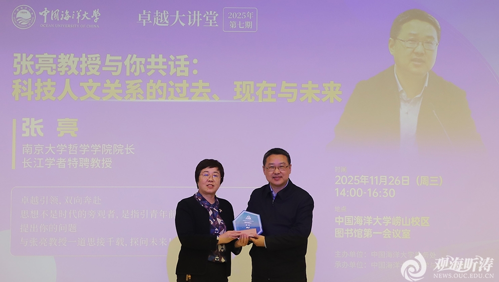 本站讯 11月26日,卓越大讲堂2025年第7期在崂山校区举办。本期活动以“科技人文关系的过去、现在与未来”为主题,特邀南京大学哲学学院院长、长江学者特聘教授张亮作专题报告。