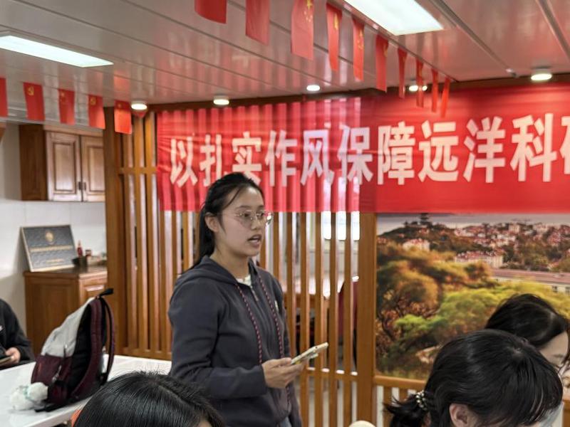 随后,姜萌昕围绕“海洋强国的战略意义”“学校在海洋强国建设中的使命担当”以及“青年学子如何将个人理想融入国家发展”三个方面对本次活动进行总结,引导学生进一步深化认识、凝聚共识。在交流研讨环节,研究生郭洋洋作为学生代表发言,她结合药学专业背景,分享了未来致力于海洋药物研发与海洋生态保护的构想。