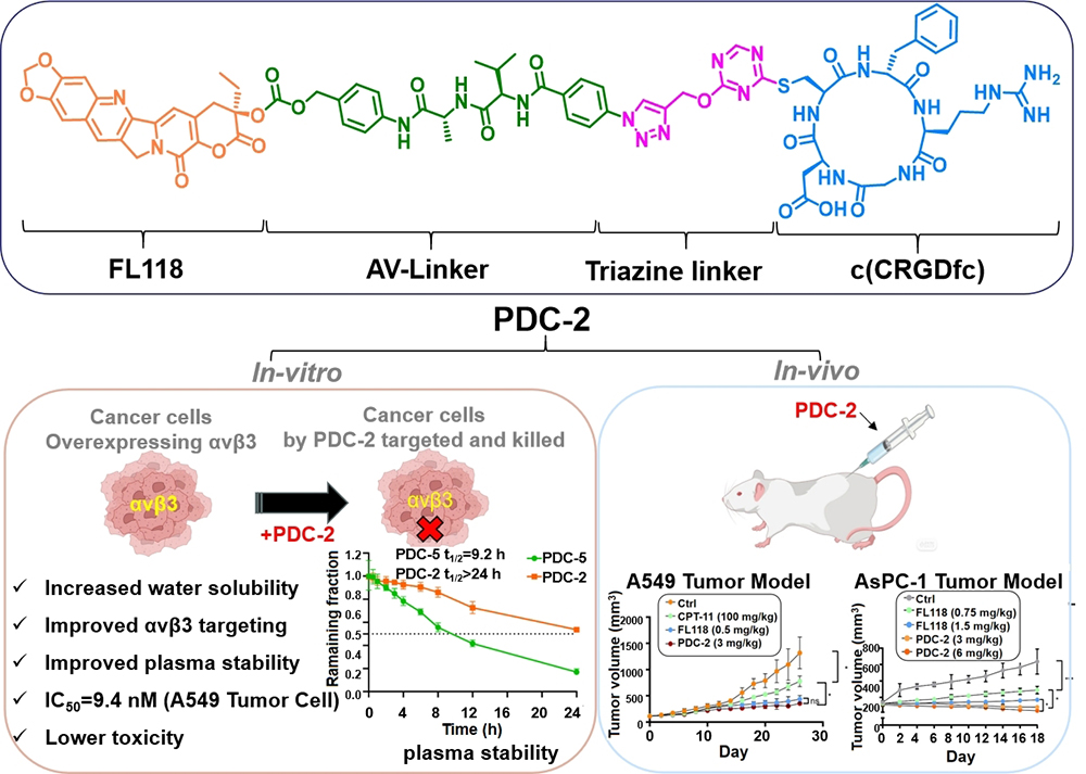 研究团队还将三嗪-吡啶化学的选择性偶联,成功应用于肽偶联药物(PDC)研究。相关成果以“Conjugating 10,11-Dimethoxy-camptothecin with an Integrin αvβ3-Targeting Peptide through a Triazine Linker for Targeted Tumor Treatment in Lung and Pancreatic Carcinoma”(通过三嗪连接子将10,11-二甲氧基喜树碱与整合素αvβ3靶向肽偶联用于肺癌和胰腺癌的靶向治疗)为题,发表在学术期刊Journal of Medicinal Chemistry。肽偶联药物的挑战是其在体内循环系统中不稳定,导致偶联的药物(Payload)释放引起体内毒性。研究团队通过三嗪环连接子的引入,设计合成PDC-2肽偶联物在血浆中展现出高稳定性,并可通过整合素αvβ3介导的内化途径,表现出强的肿瘤细胞靶向性和对肿瘤细胞的强抑制活性。机制研究表明,PDC-2能够同时下调Survivin蛋白的表达并抑制PI3K/AKT/mTOR信号通路。在整合素αvβ3过表达的肺癌A549和胰腺癌AsPC-1 的小鼠模型中, PDC-2显示出更优的肿瘤生长抑制效果和肿瘤靶向特异性,以及更低的系统性毒性。药代动力学分析表明,PDC-2可实现母体药物的持续释放,将其半衰期延长了3.4倍,并促进药物在肿瘤组织中的特异性蓄积。综上所述,PDC-2在肺癌和胰腺癌治疗中展现出良好的应用前景,是一种有潜力的候选药物。