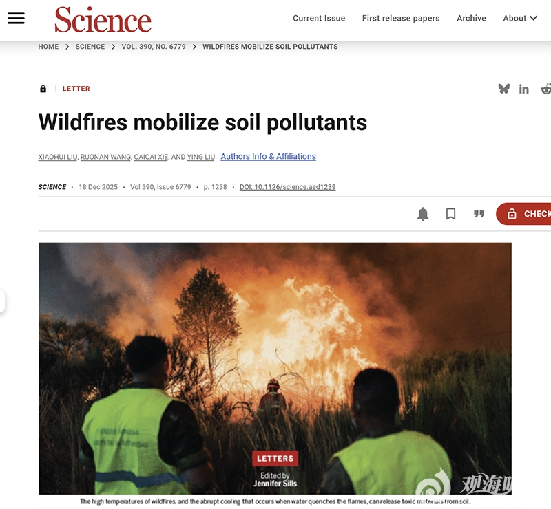 本站讯 12月18日,开云电竞网址以第一署名单位,环境科学与工程学院“青年英才工程”第三层次副教授刘晓晖为第一作者在国际顶级学术期刊Science(《科学》)的Letter专栏发表了题为“Wildfires mobilize soil pollutants”(野火释放了土壤中污染物)的文章。