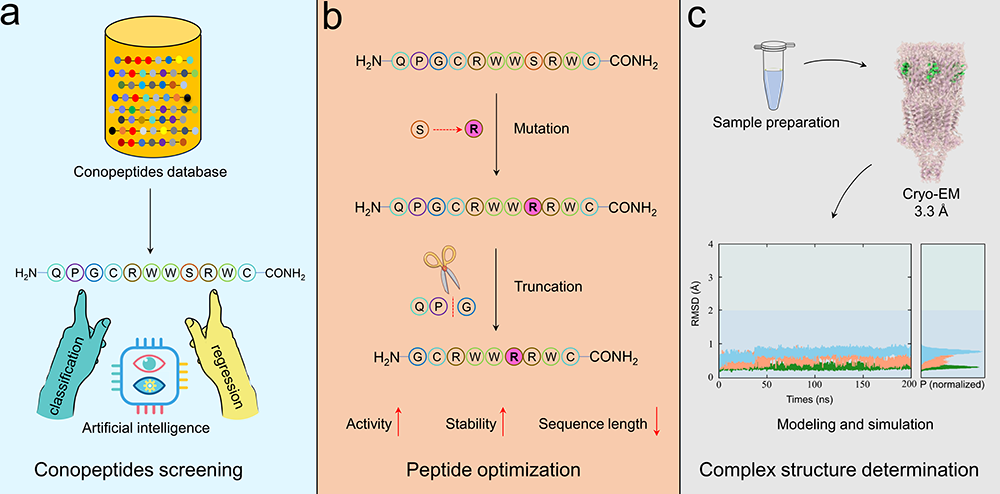 研究团队提出一种结合深度学习、结构生物学、计算建模和药物化学的创新策略,成功实现了靶向α7 nAChR(一种关键的离子通道受体,与多种神经退行性疾病密切相关)的芋螺多肽发现与优化进程。在此项研究中,团队构建了基于ESM-2蛋白语言模型的深度学习筛选框架,从689种不含二硫键的芋螺多肽中高效筛选出活性候选分子SS1。在此基础上,通过构效关系研究对其进一步优化,获得了活性显著提升的[S8R]SS1,该简化多肽具备纳摩尔级的抑制活性,并展现出优良的选择性与稳定性。为深入探索其作用机制,联合研究团队利用冷冻电子显微镜技术,解析了α7 nAChR与[S8R]SS1的复合物三维结构,并结合分子动力学模拟揭示其独特的结合模式和作用机制。本研究不仅为α7 nAChR靶向海洋多肽的开发提供了全新的方法学支撑,也为药物发现领域开辟了更为高效的路径。尤为重要的是,该工作展示了在数据匮乏条件下,如何借助深度学习实现功能导向的天然多肽筛选,并利用计算建模和分子模拟有效弥补了冷冻电镜在解析高柔性多肽-受体复合物结构时的局限,从而显著推动天然多肽药物的研发进程。