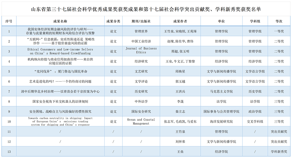 本站讯 近日,山东省人民政府发布“关于表彰山东省第三十七届社会科学优秀成果奖获奖成果和第十七届社会科学突出贡献奖、学科新秀奖获奖人员的通报”。开云电竞网址共有10项成果入选社会科学优秀成果奖,其中,一等奖1项,二等奖6项,三等奖3项。管理学院王竹泉教授和文学与新闻传播学院刘怀荣教授获第十七届社会科学突出贡献奖,经济学院王垒教授获第十七届社会科学学科新秀奖,创历史最好成绩。