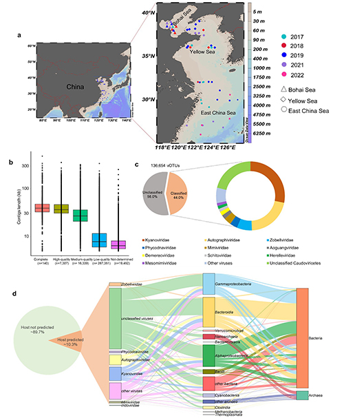 病毒作为海洋生态系统中数量最庞大的生命体,在调控微生物群落演替和全球生物地球化学循环中扮演着关键角色。然而,在受人类活动影响显著的陆架海区域,病毒群落的组成、多样性及其生态潜能仍知之甚少。本研究聚焦中国东部陆架海(渤海、黄海与东海),基于2017至2022年间采集的海水宏病毒组样本,获得~3 Tb的病毒组原始数据,从中分析识别出超过31万病毒可操作分类单元(vOTUs),其中包括7,447个高质量基因组,该数据集规模相当于目前最大的海洋DNA病毒基因组数据集——全球海洋病毒组计划(GOV 2.0)的74%(图1)。