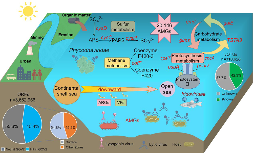 在本研究中,研究人员发现中国东部陆架海病毒具有显著的新颖性,约77%的病毒簇为ECSSC所特有,表明该区域蕴藏着大量未被认知的新病毒类群。通过对该区域6年跨度的浮游DNA病毒组研究,揭示了该区域DNA病毒群落结构的时空变化特征:渤黄海区域的病毒多样性高于东海;夏季病毒多样性显著高于冬季;在渤黄海发现鱼类和甲壳类动物的重要病原体虹彩病毒等。本研究共鉴定到超过2万个病毒编码的辅助代谢基因(AMGs),主要富集于碳水化合物、硫代谢、光合作用与甲烷代谢等通路。其中,与多糖合成与降解相关的galE、gmd基因和硫代谢相关基因cysH、cysD丰度在ECSSC中显著高于大洋、极地、深渊等其他海域,暗示在陆架海病毒可能更多的参与这些元素循环。此外,光合作用相关的基因psbA、cpeT在中国东部陆架海区域也显著富集,进一步表明病毒可能调控自养宿主的固碳过程。共鉴定出220个抗生素抗性基因和207个毒力因子,其中抗万古霉素、多粘菌素等相关基因丰度较高,并呈现 “近岸富集、离岸递减”的分布特征,与人类活动强度显著相关。本研究为理解陆架海病毒多样性和生态功能提供了重要新数据,也为后续揭示病毒驱动的陆架海生物地球化学循环奠定了基础(图2)。