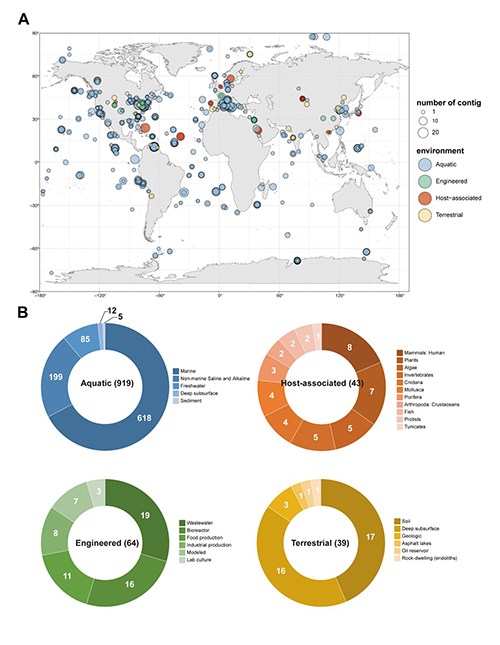 大洋螺菌目细菌是极地和深渊中丰度最高的海洋细菌类群之一,并且具有烷烃代谢能力,在海洋石油泄漏的生态修复中有重要作用。目前关于其病毒的认识集中于7株分离病毒,缺乏对其相关病毒的系统研究。本研究首次对全球非可培养大洋螺菌目相关病毒的基因组多样性、分布和生态潜能进行了系统研究,鉴定出3,273个与大洋螺菌目相关的非可培养病毒基因组,其中包括783个高质量的病毒基因组(图3),发现其在极地和温热带海洋表层丰度较高,并且从其基因组中鉴定到54个烷烃代谢相关的基因,暗示大洋螺菌目相关病毒可能在海洋烷烃循环中具有重要潜在作用。