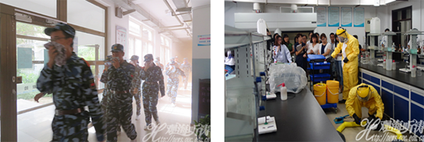 同时,对学院师生进行消防演练、危化品泄露演练培训。