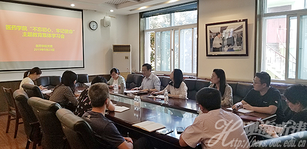 本站讯 9月23日下午,医药学院组织开展“不忘初心 牢记使命”主题教育第一次集体学习,学院领导班子成员、院长助理、党委委员、师生党支部书记参加集体学习。集体学习由学院党委书记王震主持。
